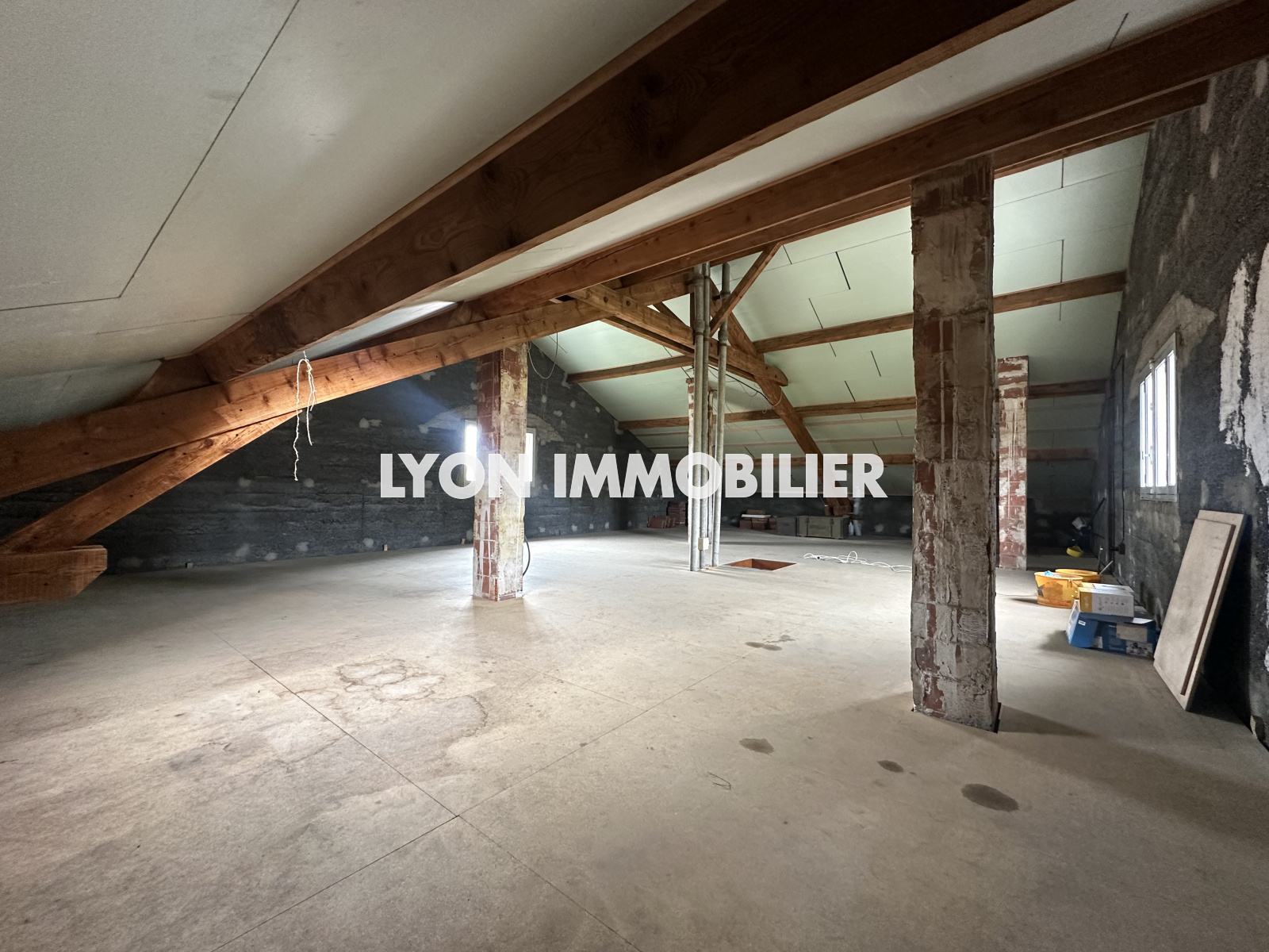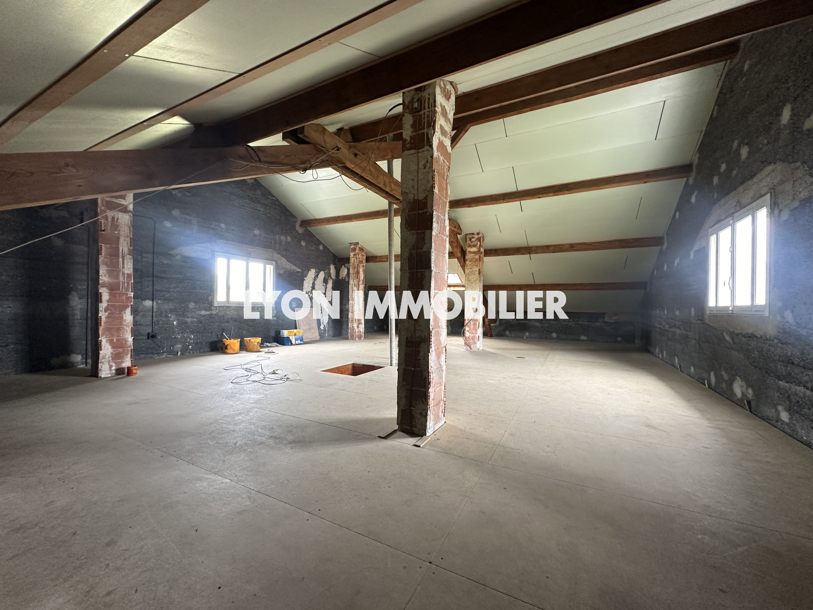Le troisième niveau est accessible depuis l'un des appartements. Vous voilà arrivé aux combles d'environ 100 m² et aménageables selon vos désirs: salle de jeux, chambres, bureaux, salle de cinéma..... La pièce est éclairée par deux fenêtres et dispose d'une très belle hauteur sous toiture.